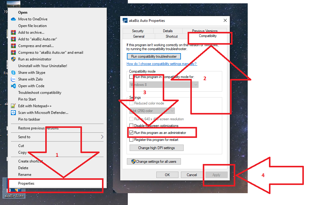 3. Chọn tab Compatibility → Tích chọn Run this program